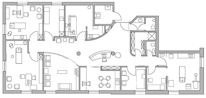 Für den Arzt stehen hier neben dem Praxisdesign in Sachen Funktionalität großzügige Räume zur Verfügung. Der Empfang liegt wie eine Insel mittendrin. Somit lebt und läuft der Praxisalltag übersichtlich. Das Praxisdesign vermittelt zusätzlich Ruhe. Und Ärzte und Patienten können neben dem Trubel in der harmonischen Atmosphäre der Praxis auch noch einmal richtig gut durchatmen.