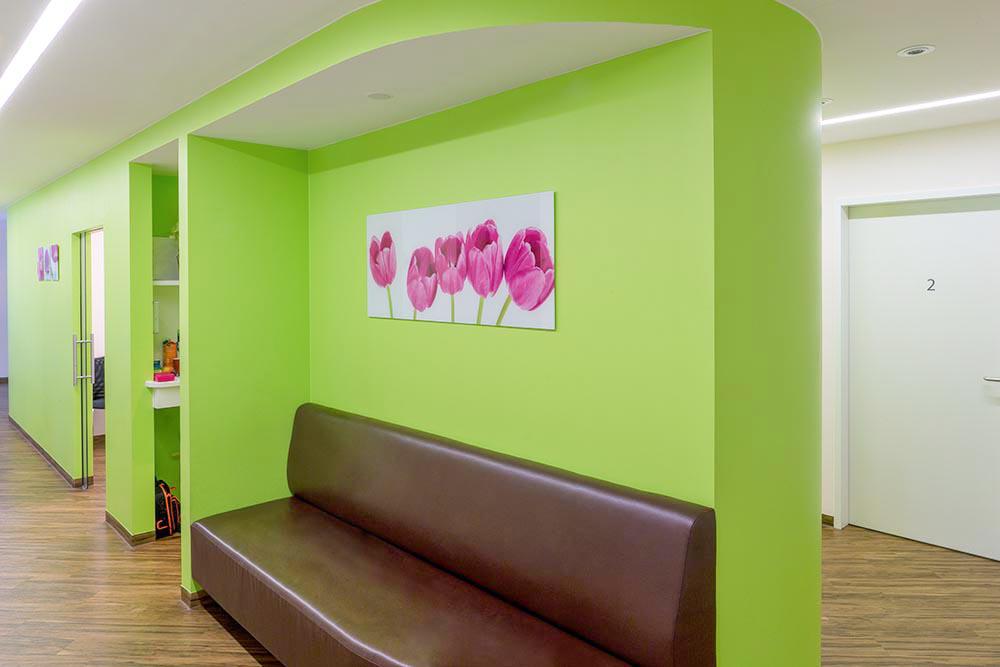 Herausgekommen ist ein Arbeitsbereich, in dem alle Rädchen beim minutiösen Ablauf, inklusive Notarzteinsätze, wie geschmiert ineinandergreifen. Das Design der Praxis, farblich in Apfelgrün gestaltet, greift mit Frische diese Dynamik und Betriebsamkeit auf. Zur „Entschleunigung“ tragen wiederum Bilder an den Wänden mit passenden Blumenmotiven bei.
